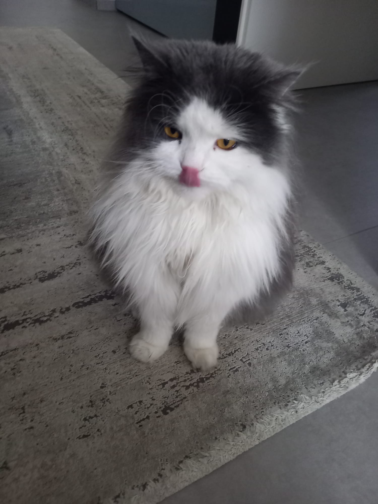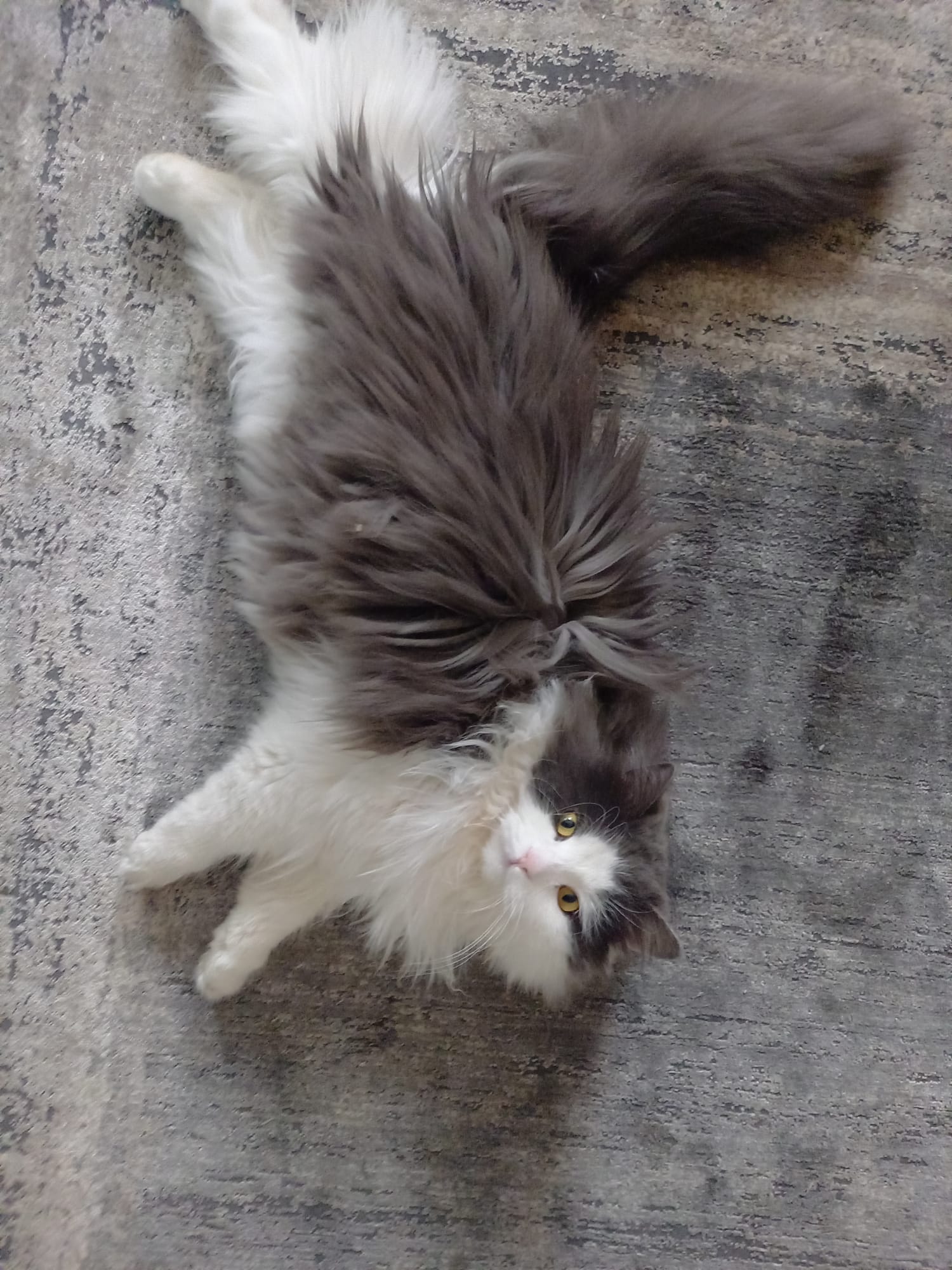 Besondere Hinweise Grau weisser Wuschelkater, 2 Jahre, kastriert Wenn man ihn streichelt, legt er sich gleich auf den Rücken. Am Brustkorb bisschen kürzeres Fell